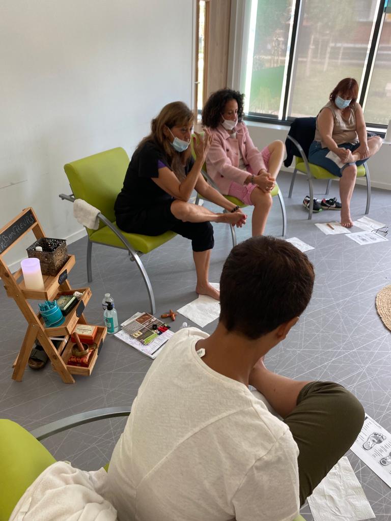 3 parties théorie avec croquis des correspondances des organes, pratique avec un échauffement du pied avec un auto-massage à l’huile, puis pression avec un stylet en bois et échange sur les ressentis et sensations. Outils de prévention santé et d’amélioration du sommeil .